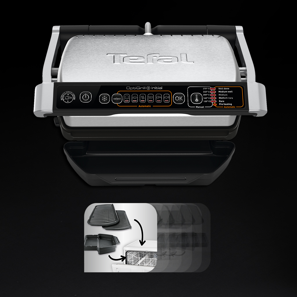 Гриль Tefal GC706D34 простий у використанні: щоб встановити потрібний режим або вибрати програму, натисніть на потрібну кнопку на панелі керування. Після приготування гриль легко упорядкувати: знімні робочі пластини та лоток для соку придатні для миття в посудомийній машині.