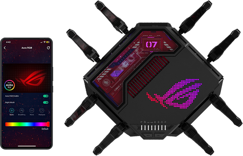 Система підсвічування ROG Rapture GT-BE19000 підтримує світлові ефекти, які дозволяють користувачам створити стильну атмосферу. Ці ефекти можна легко налаштувати за допомогою вебінтерфейсу або застосунку ASUS Router. А новий ексклюзивний нічний режим зробить атмосферу перед сном більш затишною.