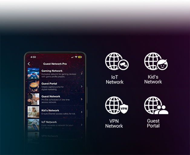 Технологія ASUS Guest Network Pro спрощує створення виділених підмереж з окремими SSID та VLAN, а також підключення до них пристроїв. Вона пропонує такі функції, як просте налаштування пристроїв IoT, миттєве VPN-з’єднання та персоналізований гостьовий портал.
