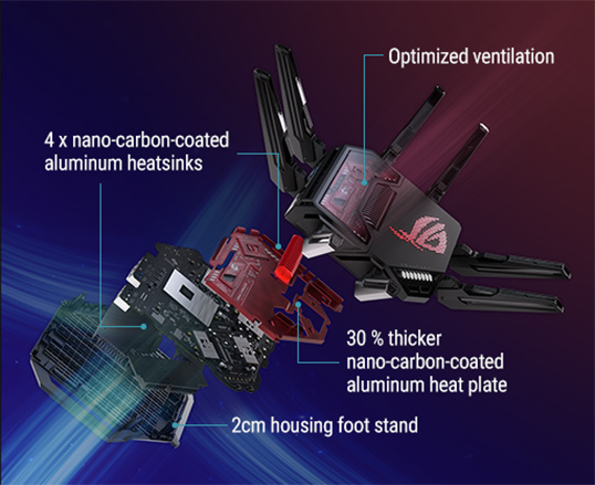 ROG Rapture GT-BE19000 отримав на 30% товщу* алюмінієву пластину у верхній частині, радіатори з нанесений абразивним методом нановуглецевим шаром і двосантиметрову підставку. Окрім цього, вентиляційні отвори спеціальної форми та теплорозподільник покращують повітряний потік і на 18% підвищують ефективність розсіювання тепла.