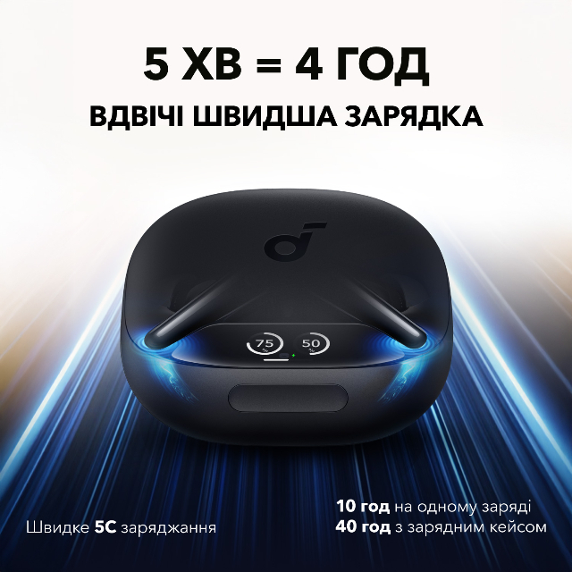 Навушники soundcore Liberty 4 Pro заряджаються вдвічі швидше ніж попередні моделі. 5-хвилинна підзарядка забезпечує 4 години відтворення. Насолоджуйтесь до 10 годин від однієї зарядки, з можливістю продовження до 40 годин за допомогою кейсу.